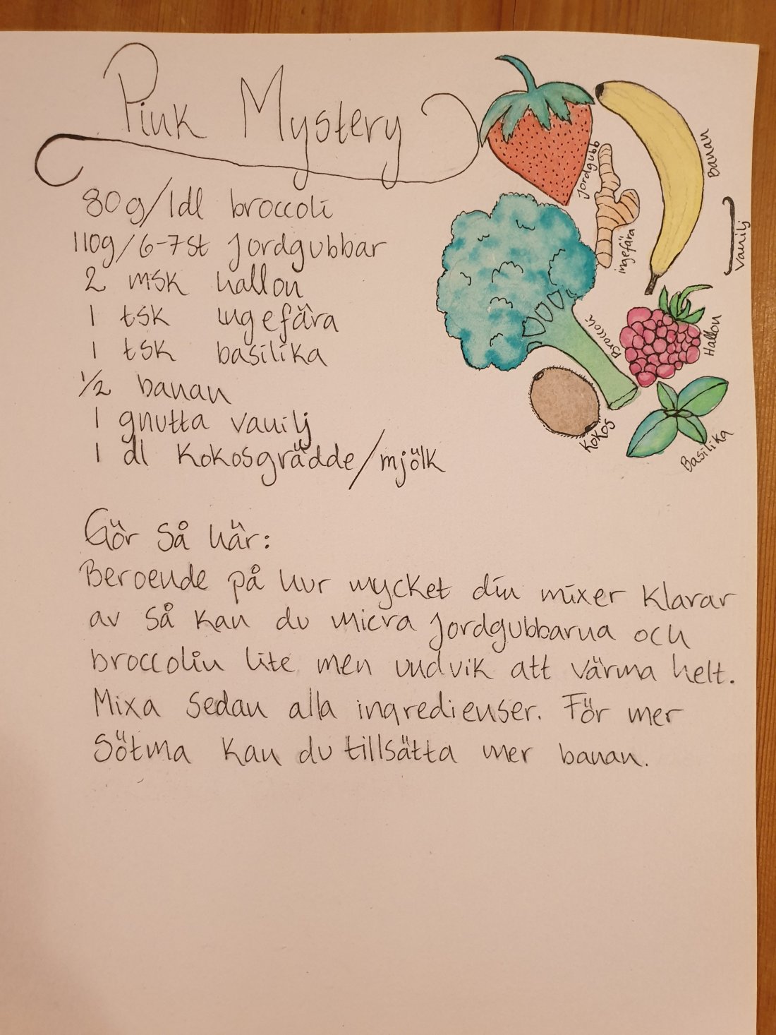 Dagens smoothie heter Pink Mystery, och vad är då så mystiskt med denna.. inget egentligen, heheh, mer än att många reagerar på smakkombinationerna 😊 basilika, kokosmjölk, jordgubb och broccoli är kanske inte det första man tänker på när man ska slänga ihop en smoothie men det funkar! Jag lovar och både basilikan, broccolin och ingefäran innehåller ju massa nyttigheter + C-vitamin från bären och frukten.
